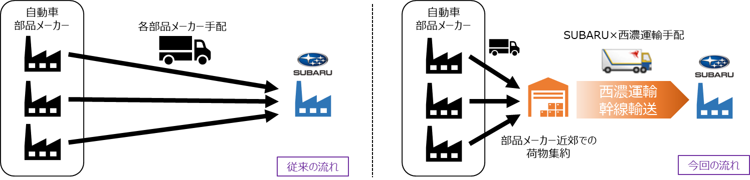 従来、自動車部品の調達は、自動車部品メーカー自ら貸切車両を手配し、SUBARUの工場まで直接納入する必要がありました。この取り組みにより、中京地区の自動車部品メーカーは西濃運輸豊川支店へ部品を持ち込むだけで済み、SUBARUは以降の幹線輸送を主体となって手配・管理することが可能となります。SUBARUが自ら物流をコントロールし、積載率の高い高効率な輸送を行うことで、トラックドライバー不足の緩和や温室効果ガス排出量削減といった環境負荷低減に貢献し、自動車部品メーカーの物流負担軽減にもつながります。
